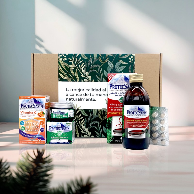 Nuestro Pack Regalo Protecsapin es el mejor regalo de navidad que podrás hacer a tu persona favorita para que se cuide este invierno. Está compuesto por una selección de productos para el Confort Restpiratorio: nuestro famoso Jarabe Protecsapin con comprimidos masticables, formulado con una amplia selección de extractos naturales de plantas, que ayudan a suavizar la tos y las molestias de garganta. Además, este pack incluye Vitamina C Protecsapin 500 mg + Vitamina D3 + Selenio + Zinc, que contribuyen al funcionamiento normal del sistema inmunitario y un Bálsamo Pectoral Protecsapin para masaje con ingredientes naturales. Regala nuestro Pack Protecsapin y cuida este invierno de los que más quieres.