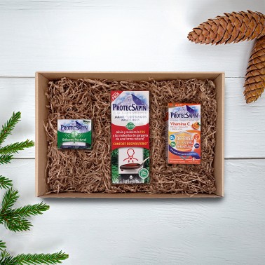 Nuestro Pack Regalo Protecsapin es el mejor regalo de navidad que podrás hacer a tu persona favorita para que se cuide este invierno. Está compuesto por una selección de productos para el Confort Restpiratorio: nuestro famoso Jarabe Protecsapin con comprimidos masticables, formulado con una amplia selección de extractos naturales de plantas, que ayudan a suavizar la tos y las molestias de garganta. Además, este pack incluye Vitamina C Protecsapin 500 mg + Vitamina D3 + Selenio + Zinc, que contribuyen al funcionamiento normal del sistema inmunitario y un Bálsamo Pectoral Protecsapin para masaje con ingredientes naturales. Regala nuestro Pack Protecsapin y cuida este invierno de los que más quieres.